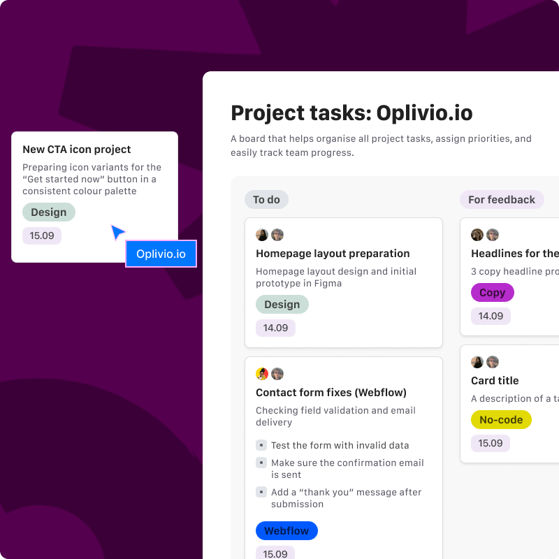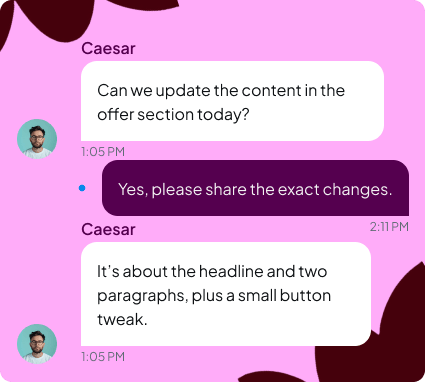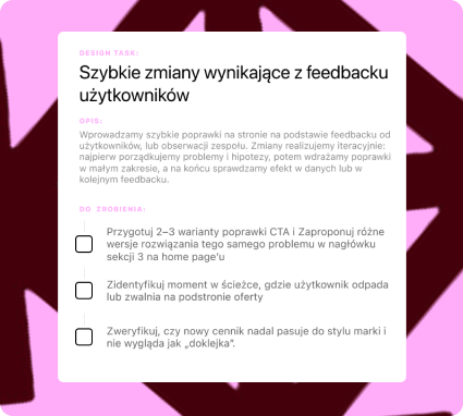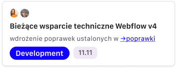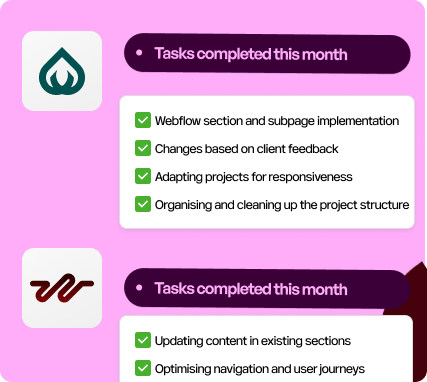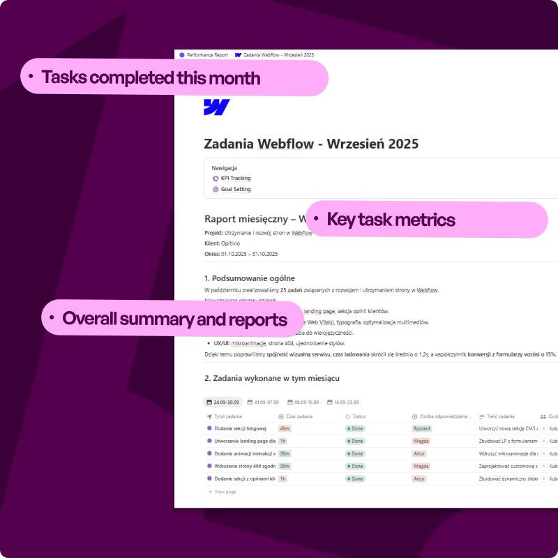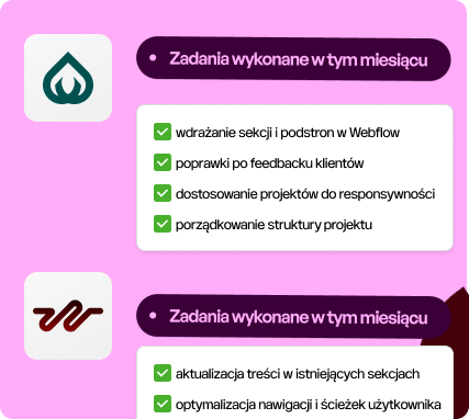 Możesz wrzucać requesty dotyczące Webflow, no-code i UI. Przejmujemy realizację techniczną i projektową, żeby Twój zespół mógł skupić się na strategii i kliencie.