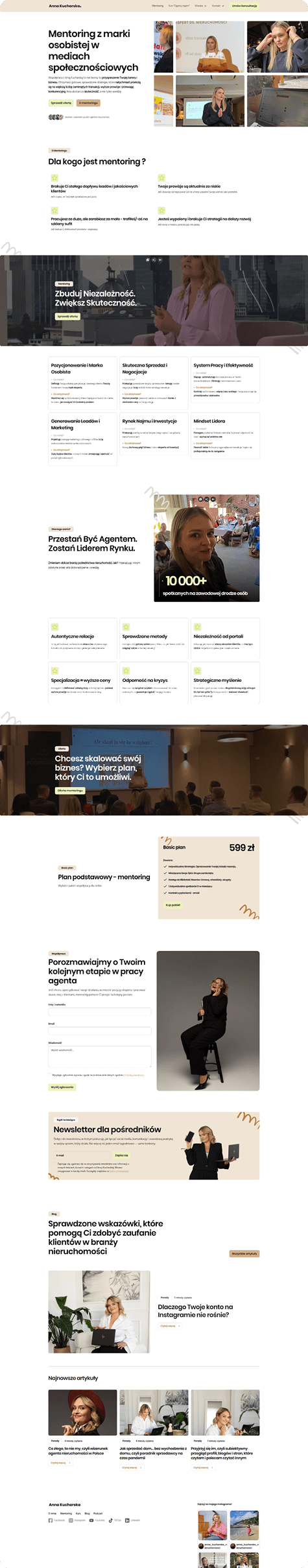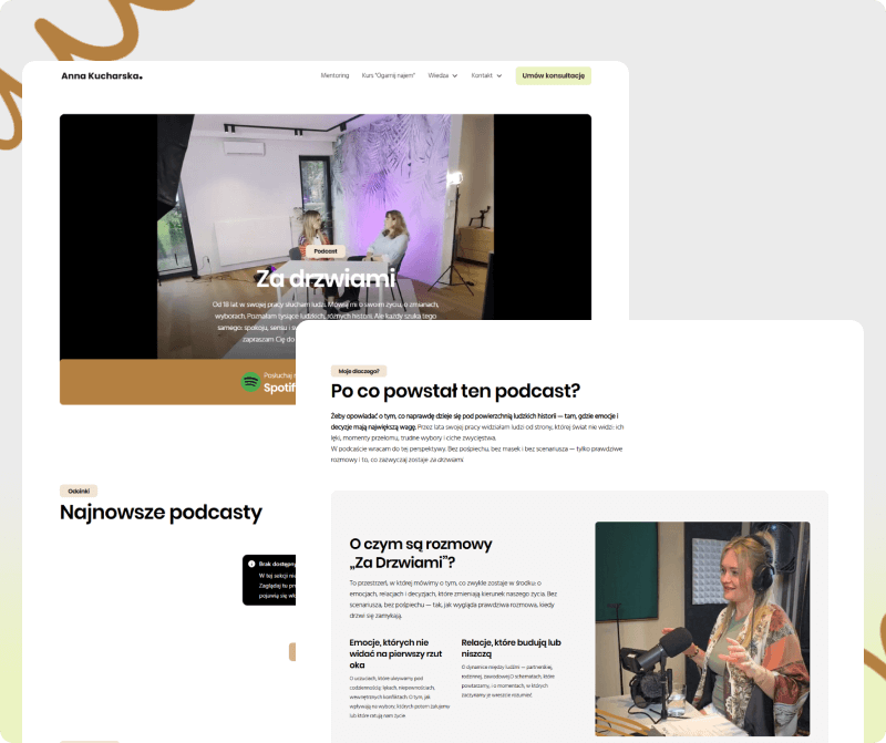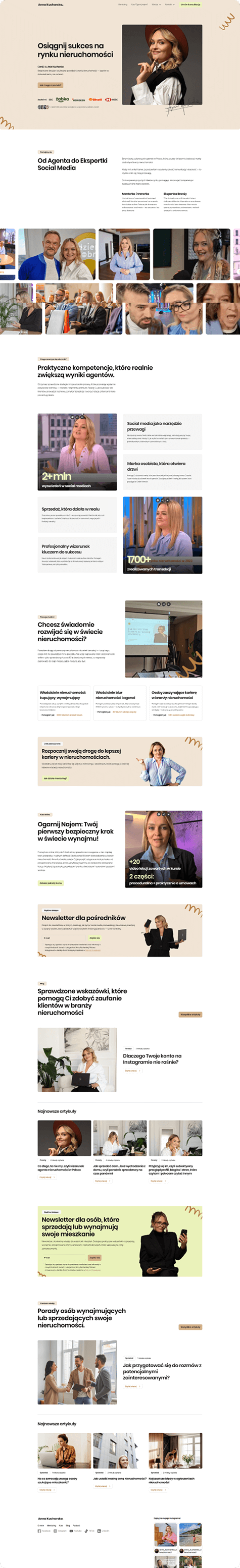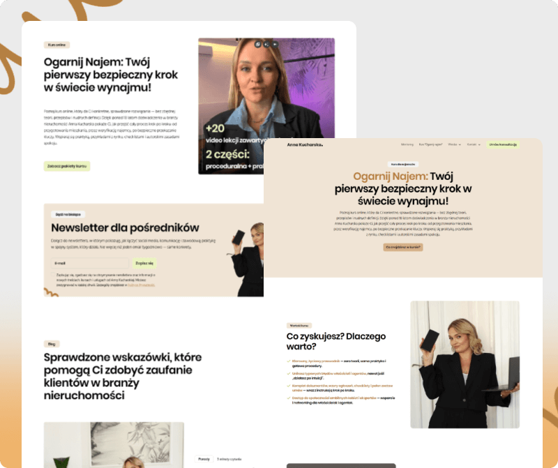 Głównym celem było wykorzystanie potencjału wideo, eventów i obecności medialnej klientki do zbudowania silnego autorytetu oraz stworzenia strony, która wzmacnia jej markę osobistą, jasno komunikuje eksperckość i jednocześnie daje dedykowaną przestrzeń pod sprzedaż autorskiego kursu.