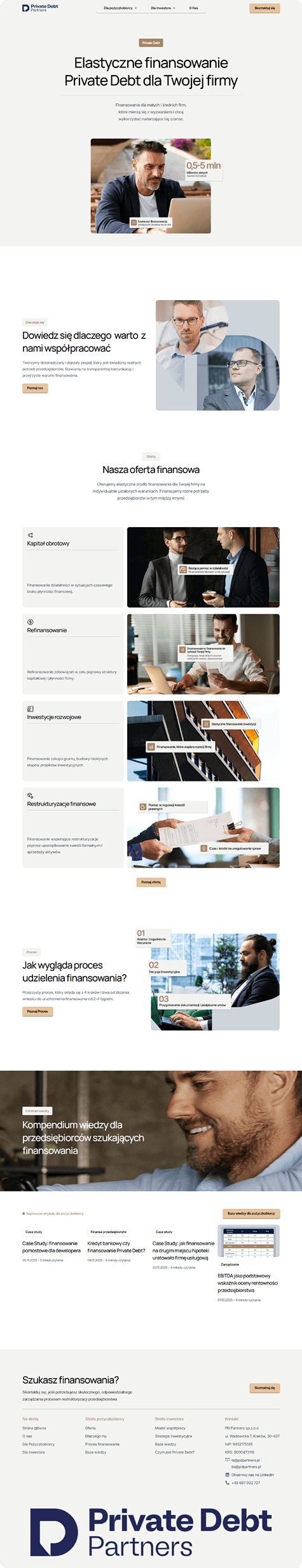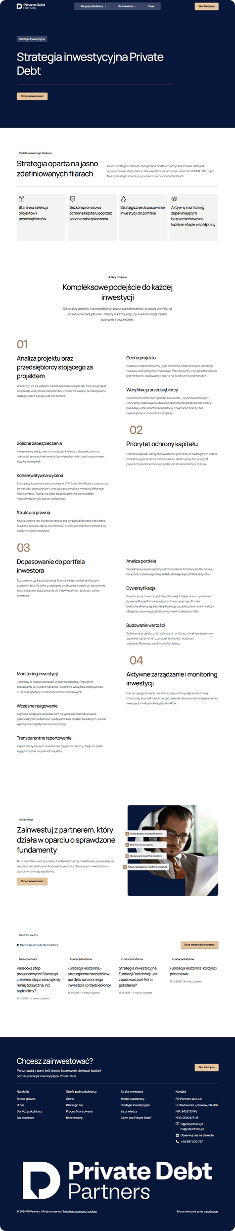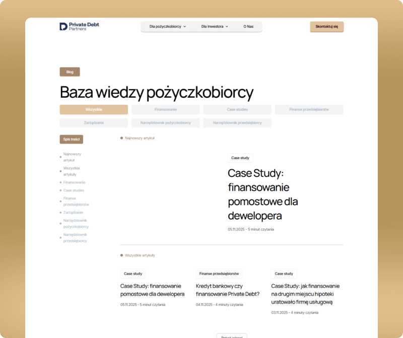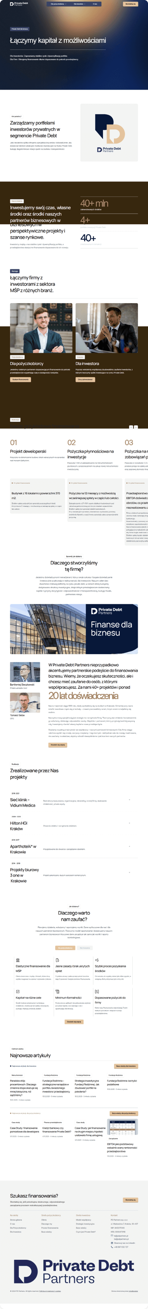 Celem projektu było stworzenie jednej, spójnej strony, która jasno tłumaczy model działania Private Debt Partners, porządkuje ofertę pod kątem różnych odbiorców i prowadzi użytkownika od pierwszego kontaktu z marką aż do wykonania konkretnej akcji. Równie ważne było nadanie stronie odpowiedniego charakteru wizualnego i komunikacyjnego