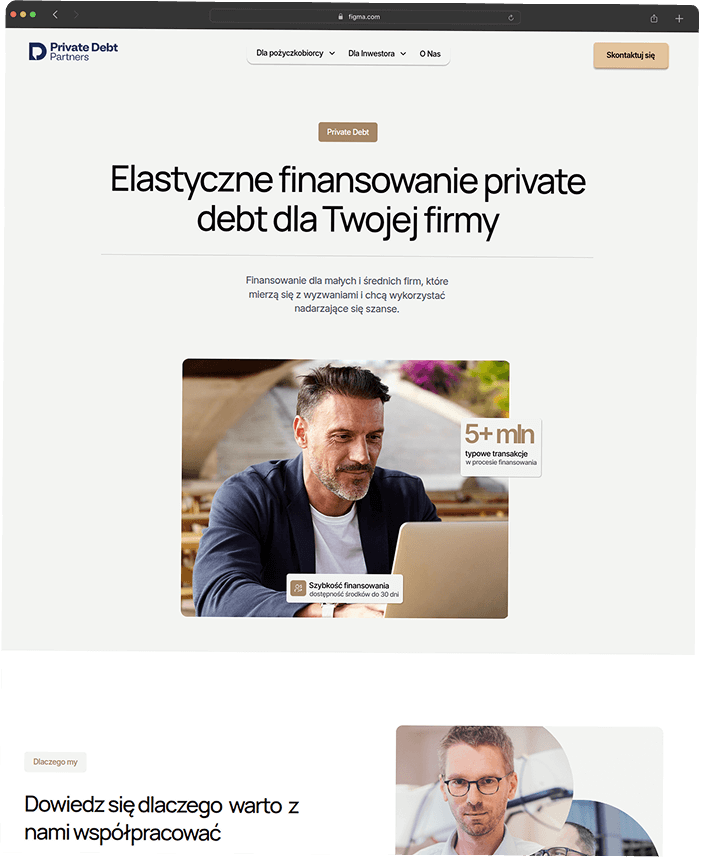 Private Debt Partners to projekt, w którym kluczowe było uporządkowanie komunikacji w wymagającej branży finansowej.Efektem jest spójna platforma oparta na przemyślanym designie, skalowalnym Webflow i komunikacji, która prowadzi użytkownika krok po kroku zamiast zostawiać go z pytaniami.